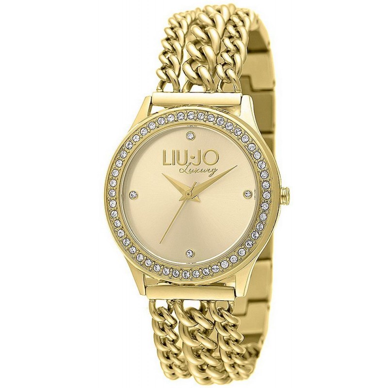 Marke: Liujo; Kollektion: Atena; Artikelcode: TLJ934; Produkttyp: Uhr; Geschlecht: Frau; Funktionen: Nur Zeit; Uhrwerk: Quarz / Batterie; Gehäusematerial: Edelstahl; Gehäusefarbe: Gold; Gehäusedurchmesser Ø: 35 mm; Zifferblatt: Analog; Zifferblattfarbe: Gold; Bandmaterial: Edelstahl; Armbandfarbe: Gold; Wasserbeständigkeit: 30 Meter / 3 bar.